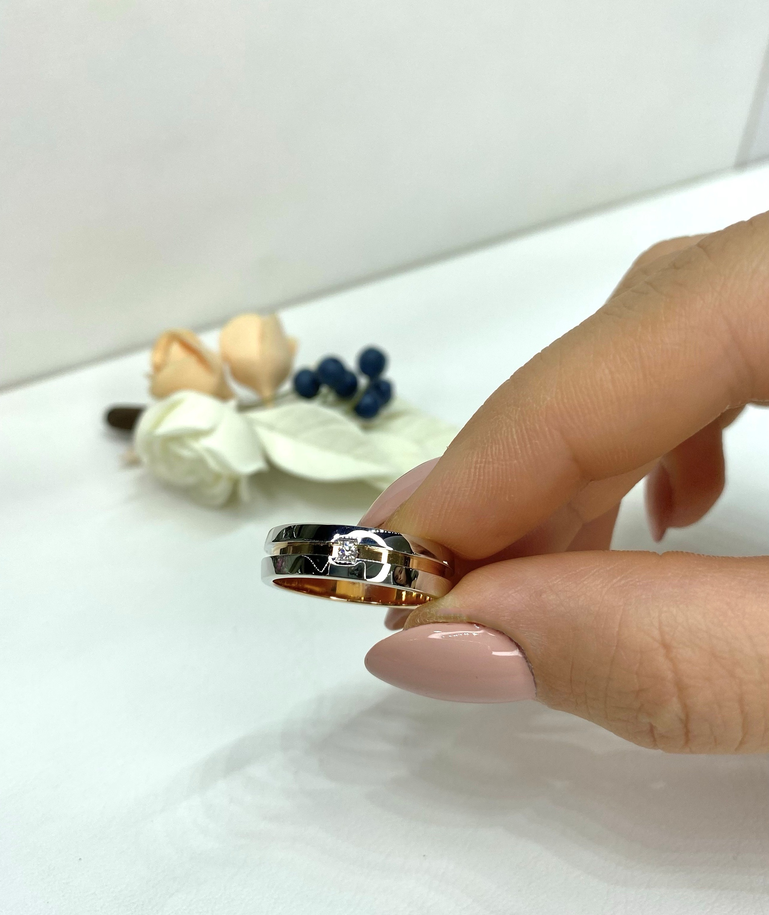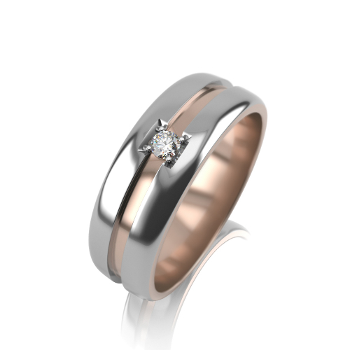 Полновесное обручальное кольцо из красного и белого золота 585 пробы, форма кольца прямая "шайба", со вставкой из бриллианта, который придает искрящийся блеск