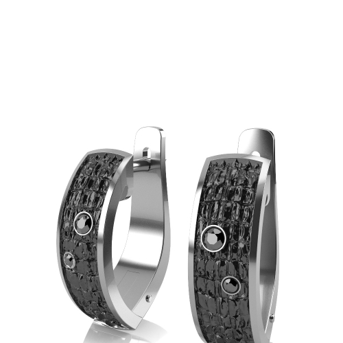 Стильные серьги, выполнены из серебра 925 пробы, с покрытием керамики чёрного цвета и чёрными фианитами. Фианиты не выступают относительно поверхности, за счет глухой закрепки, она надежно удерживает камни. Смотрится очень эффектно и современно.