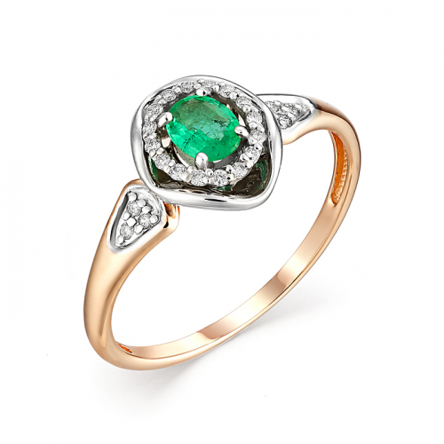 Кольцо выполнено из розового золота 585 пробы. Основной камень кольца - изумруд природного происхождения овальной формы и вокруг обрамлен бриллиантами. Дизайн кольца необычный и привлекает внимание, на руке смотрится аккуратно и изящно.