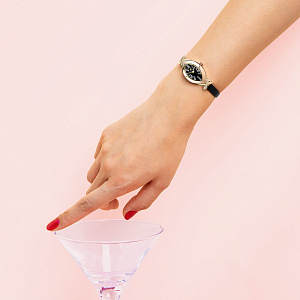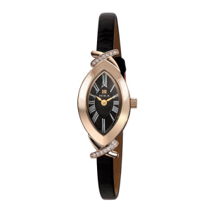 Удлиненный корпус из красного золота 585 пробы женских часов выполнен в игривой форме кошачьего глаза. Его переплетенные вершины украшены 14 фианитами. Внутри установлен надежный швейцарский механизм. Аристократичный циферблат защищен устойчивым к царапинам минеральным стеклом с сапфировым напылением. Часы комплектуются узким ремешком из натуральной кожи. В комплект поставки входит: