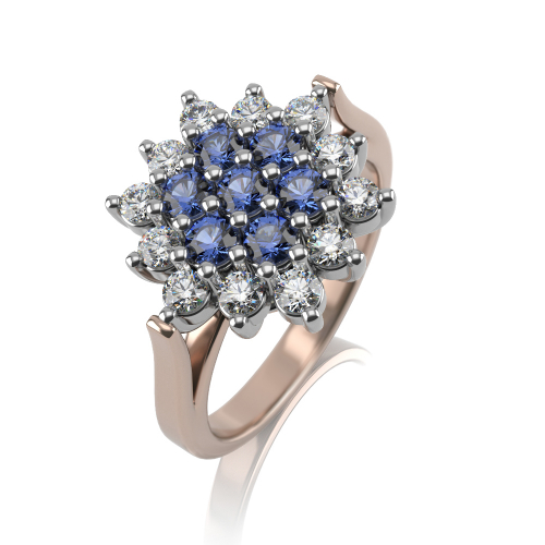 Роскошное кольцо из красного и белого золота 585 пробы с драгоценными камнями, натуральными сапфирами и бриллиантами