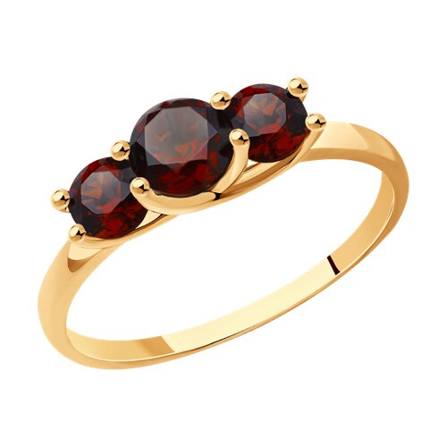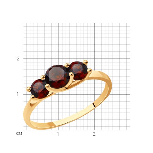 Изящное кольцо, украшенное тремя гранатами, круглой формы огранки, выполнено из красного золота 585 пробы