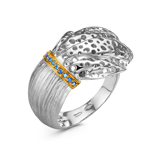 Стильное кольцо с оригинально обработанной поверхностью, выполнено из родированного серебра и элементами золочения 925 пробы