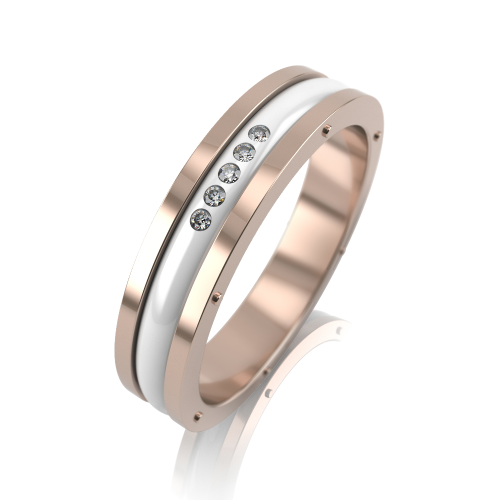 Оригинальное обручальное кольцо с прямым профилем в виде шайбы, из красного золота 585 пробы с белой керамикой и бриллиантами.