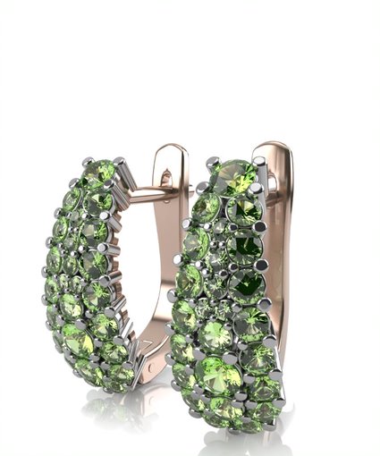 Яркие и привлекательные серьги, украшеные дорожкой сияющих изумрудов, выполнены из красного золота 585 пробы