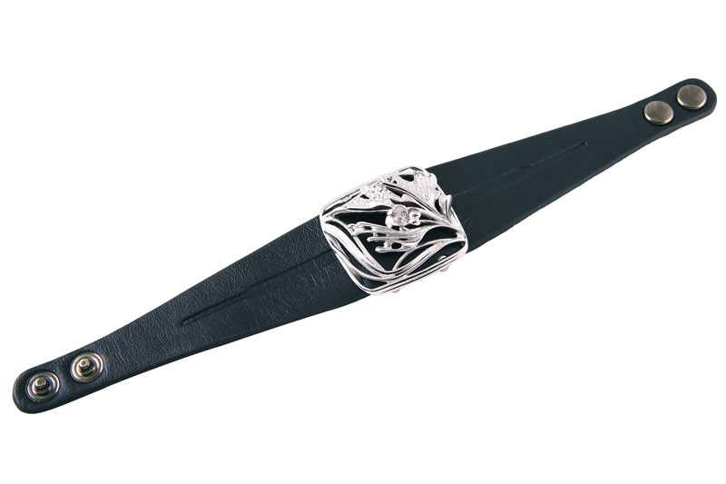 Стильный браслет в виде натурального кожаного черного ремешка с декоративной вставкой из серебра 925 пробы