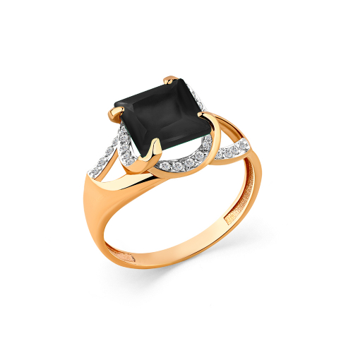 Стильное кольцо, украшенное оригинальным сочетанием чёрного агата и сверкающих фианитов, выполнено из красного и белого золота 585 пробы