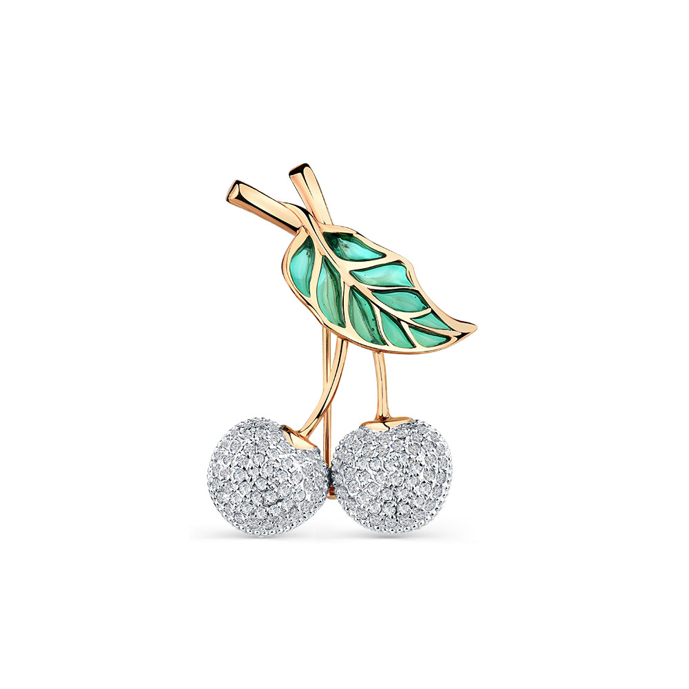 Элегантная брошь в виде кисточки с двумя вишенками, украшенными фианитами, блеск которых подчёркивает листик с ювелирной зелёной эмалью, выполнено с сочетанием красного и белого золота 585 пробы