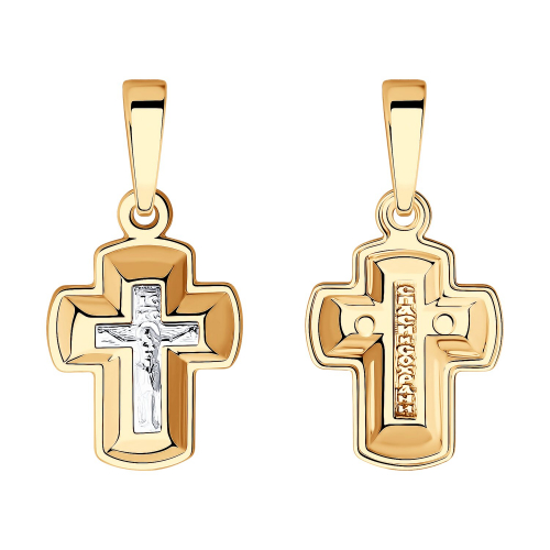 Подвеска в виде нательного креста выполнена из комбинированного золота 585 пробы. Крест соответствует всем канонам Православной церкви, на внешней стороне - распятие, на обороте надпись "Спаси и сохрани". Данный символ веры охраняет и защищает того человека, которому принадлежит, поэтому подойдёт не только взрослому, но и ребёнку. Изделие представлено брендом "SOKOLOV". В комплект поставки входит: