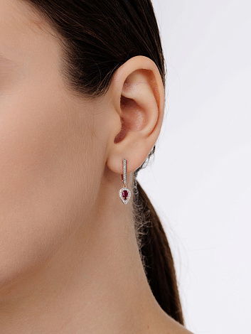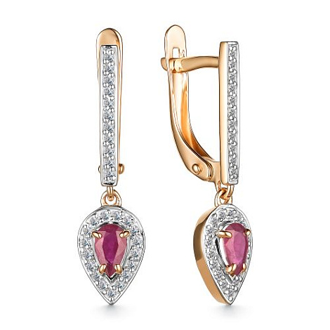 Серьги с подвесками, украшенными натуральными рубинами в окружении сверкающих бриллиантов, выполнены с сочетанием красного и белого золота 585 пробы. Закрепка бриллиантов на белом золоте зрительно увеличивает их объём и усиливает сияние камней. Тип замка - английский, самый надежный и удобный. Изделие представлено брендом Алькор. Средняя характеристика камней: 56 Бриллиант Круг 57 0.188 4/5; 2 Рубин Груша 0.455 2/2. В комплект поставки входит: