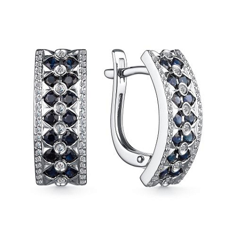 Объемные серьги украшены россыпью сверкающих сапфиров глубокого синего цвета и бриллиантами, выполнены из белого золота 585 пробы. Тип замка - английский, самый надежный и удобный. Изделие представлено брендом АЛЬКОР. Средняя характеристика камней: 16 Бриллиант Круг 57 0.091 4/5; 28 Сапфир Круг 1.287 2/2; 80 Бриллиант Круг 17 0.2 2/3. К украшению прилагается сертификат от производителя о подлинности драгоценных камней. В комплект поставки входит: