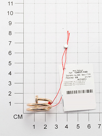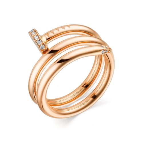Стильное кольцо в виде "гвоздя" выполнено из красного золота 585 пробы, украшено сияющими бриллиантами