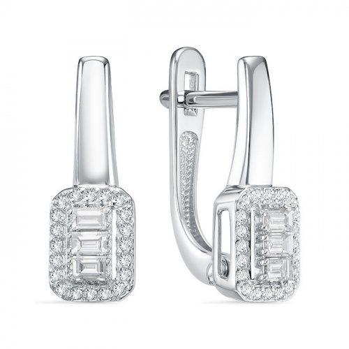 Роскошные серьги выполнены из белого золота 585 пробы, украшены великолепными сияющими бриллиантами. Блеск благородного металла в сочетании с сияющими бриллиантами, привлекают внимание с первого вгляда. Огранка камней максимально раскрывает их красоту, а оправа позволяет лучам света играть на их поверхности, делая их ещё более искристыми. Особый дизайн сережек превращает их в эффектную самостоятельную деталь любого образа.Тип замка - английский, самый надежный и удобный. Изделие представлено брендом ИМПЕРИАЛ. Средняя характеристика камней на артикул: 6 Бр багет (25-20) 3/4А 0,270Ct ,40 Бр Кр-57 (400-200) 3/6А 0,200Ct В комплект поставки входит: