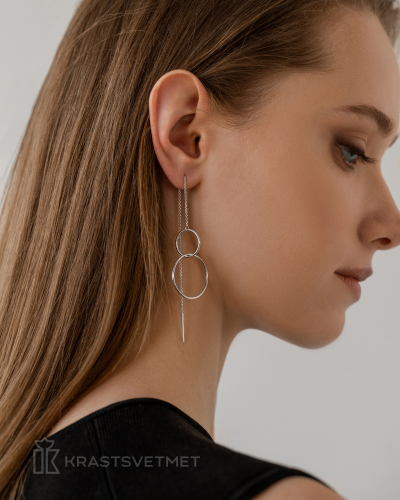 Элегантные серьги-протяжки с подвесной частью в виде колец выполнены из родированного серебра 925 пробы