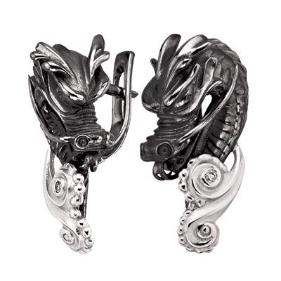 Оригинальные эффектные серьги "Водяной дракон" выполнены в серебре 925 пробы с фианитами