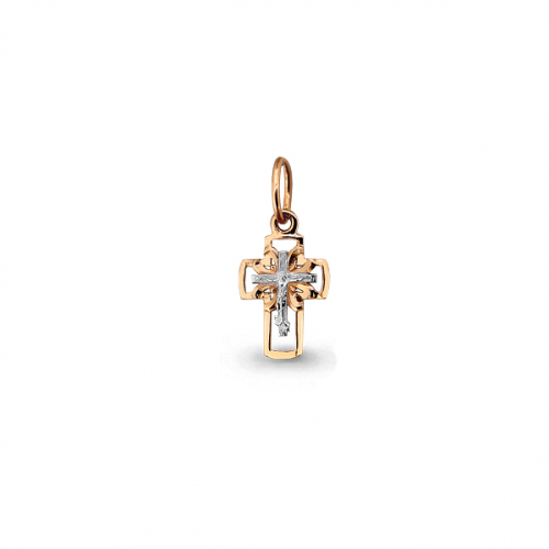 Миниатюрный православный крест для ребенка, выполнен в сочетании красного и белого золота 585 пробы, в нем исполнены все каноны Православной Церкви, на внешней стороне креста распятие, на обороте надпись "спаси и сохрани"