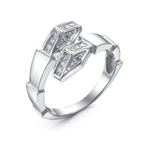 Кольцо с геометричным дизайном, украшенным фианитами, выполнено из родированного серебра 925 пробы