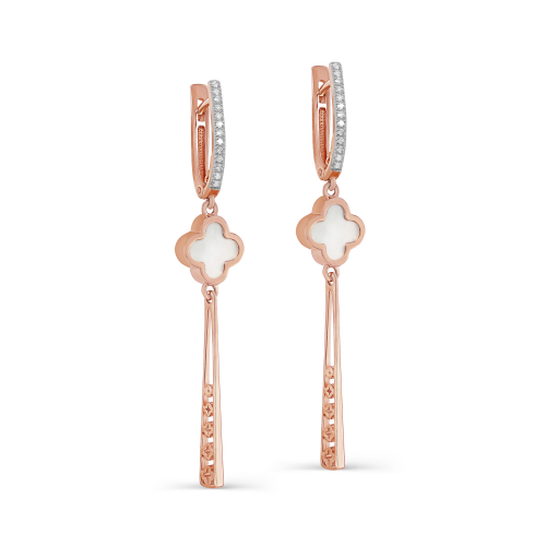 Роскошные удлинённые серьги с белым перламутром, нежную красоту которого подчёркивают дорожки сверкающих бриллиантов, выполнены с сочетанием красного и белого золота 585 пробы