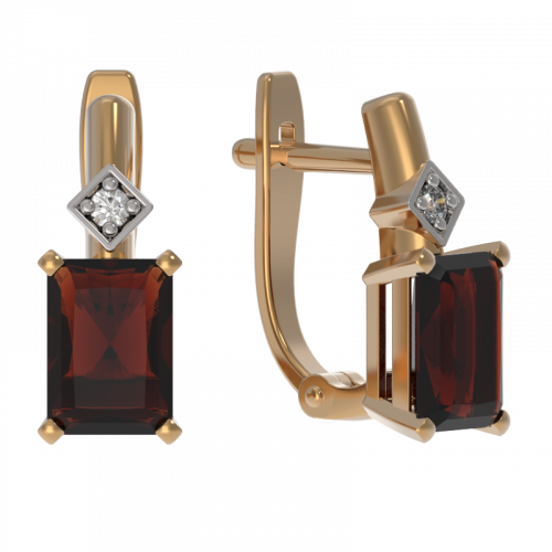 Лаконичные серьги классического дизайна выполнены из комбинированного золота 585 пробы, украшенные великолепными гранатами и сияющими фианитами