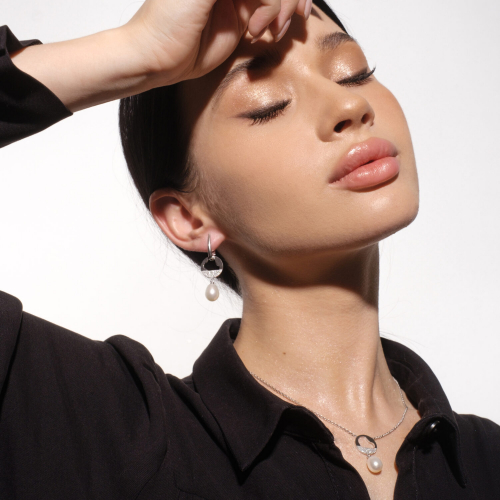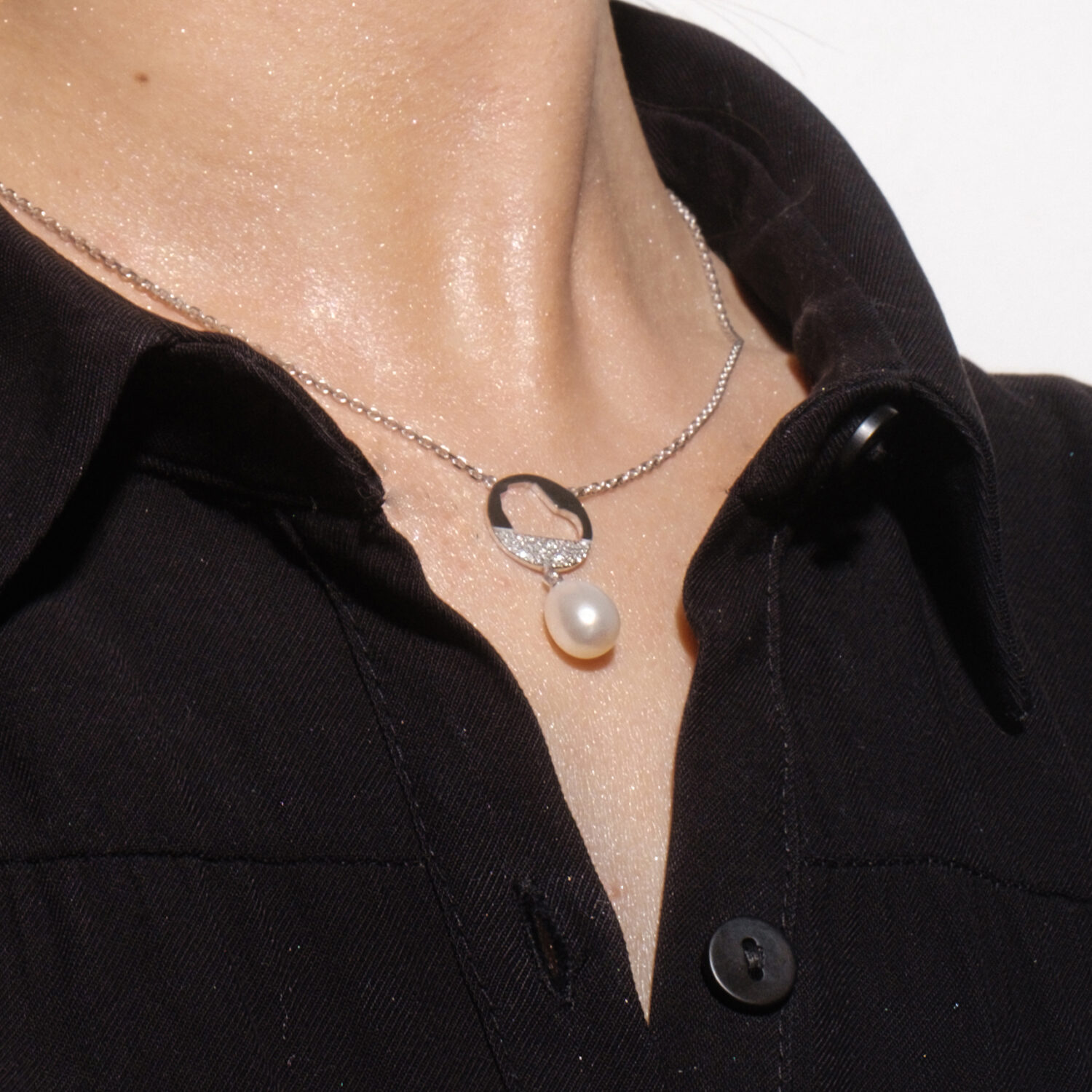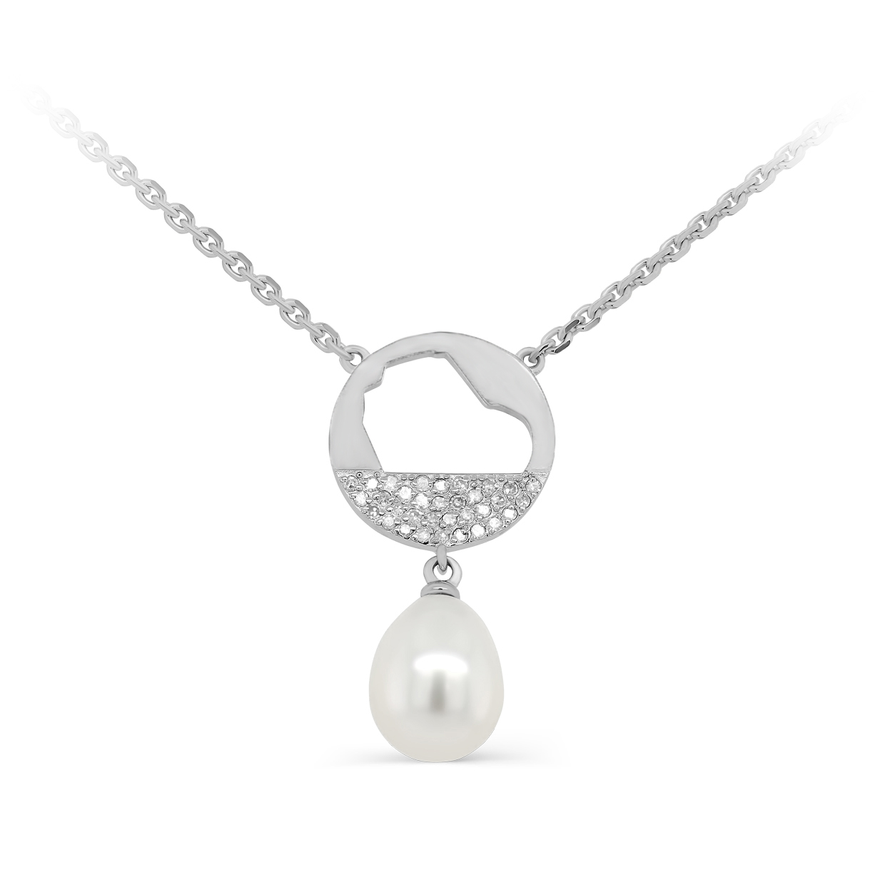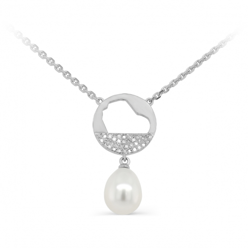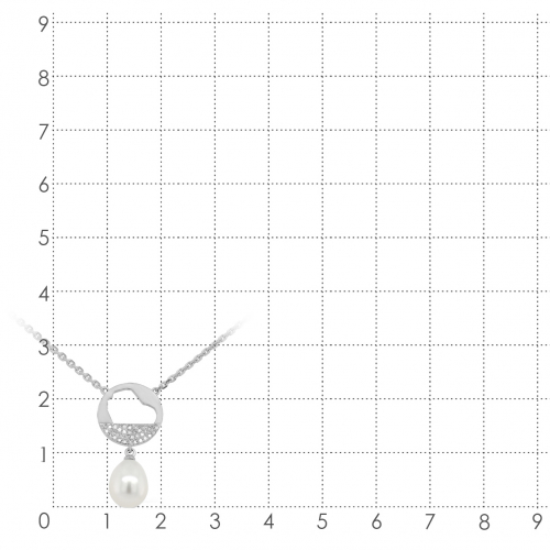 Элегантное цепочное кольес подвеской круглой формы, украшенной жемчугом и фианитами, выполнено из серебра 925 пробы