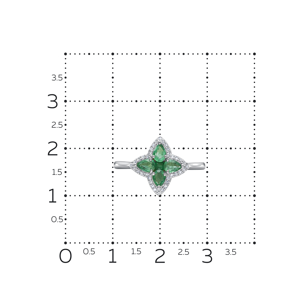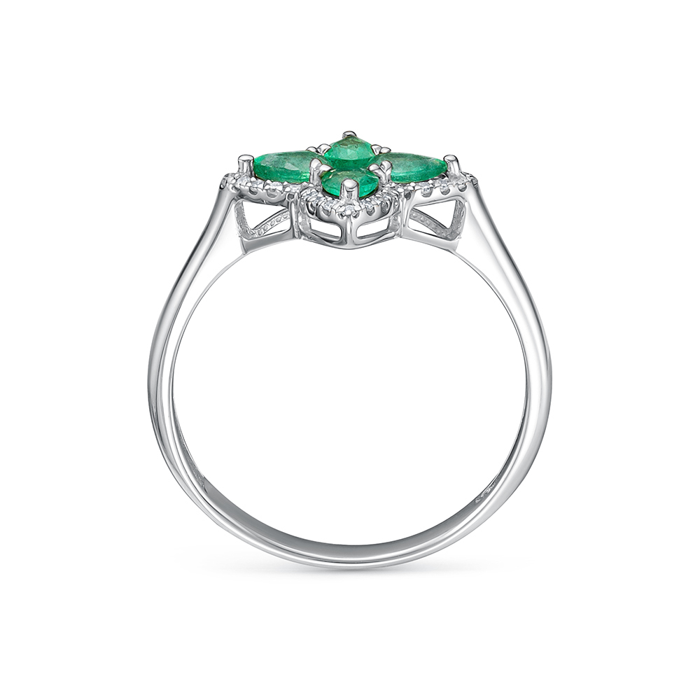 Яркое кольцо с натуральными изумрудами в инкрустации россыпи сверкающих бриллиантов выполнено из белого золота 585 пробы