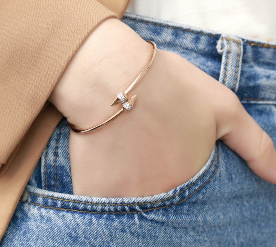 Элегантный женский жесткий браслет из белого и желтого золота 585 пробы, украшенный изящной россыпью сверкающих фианитов