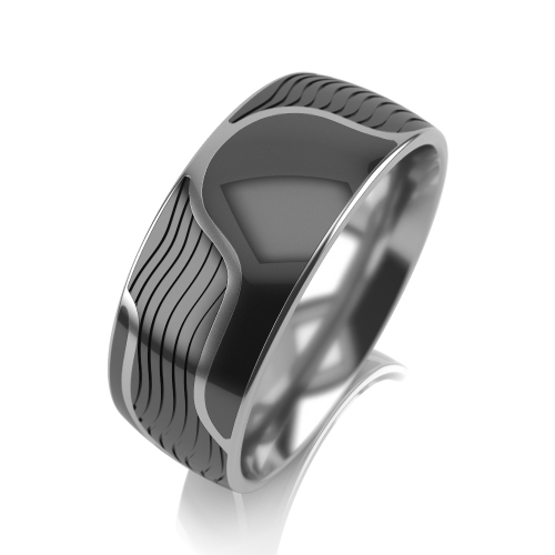 Стильное кольцо из серебра 925 пробы с оригинальным дизайном в виде волнистых линий на черной керамике