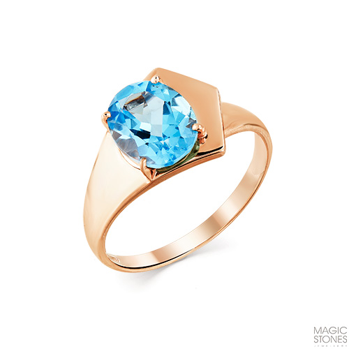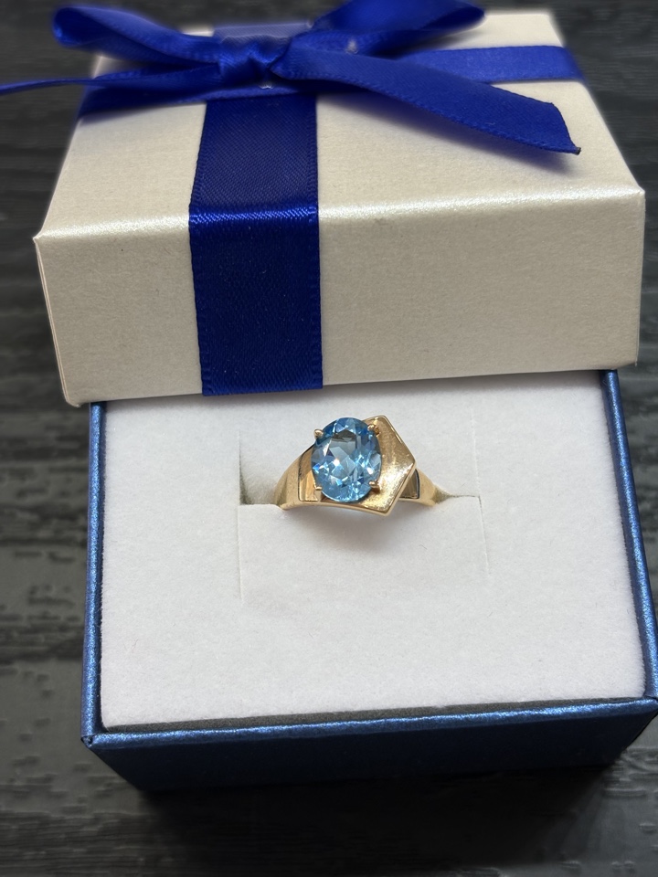 Кольцо выполнено из красного золота 585 пробы, украшено голубым топазом овальной формы