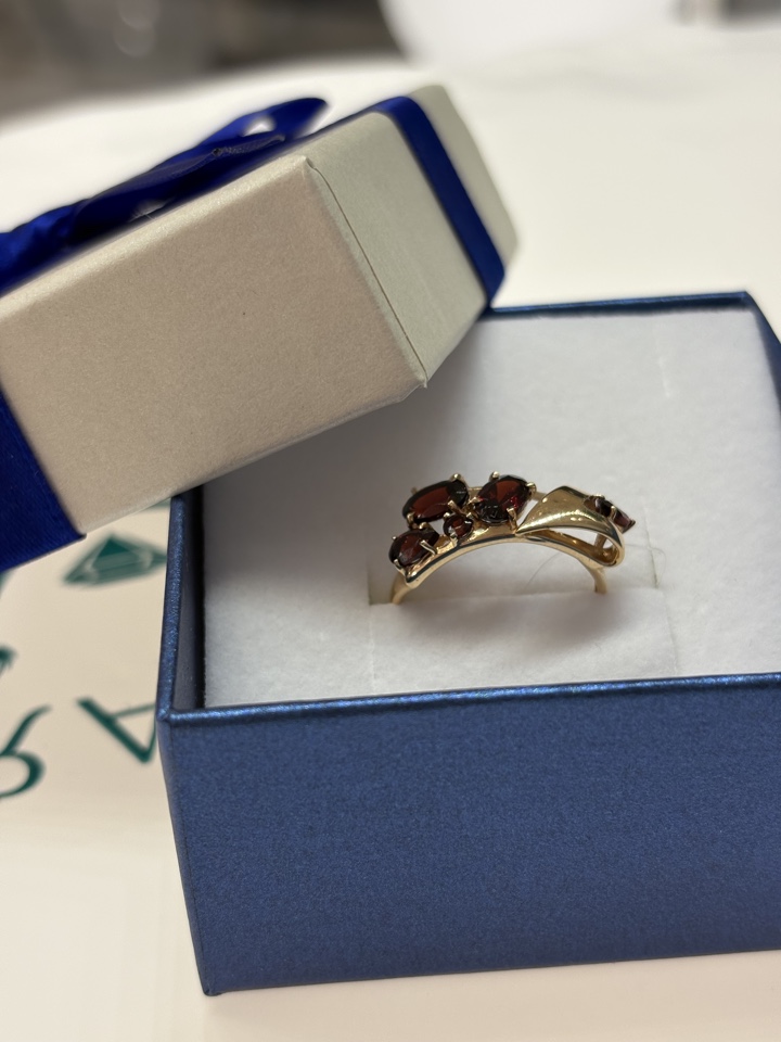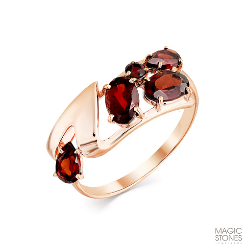 Оригинальное кольцо из красного золота 585 пробы, украшено россыпью гранатов различной формы огранки