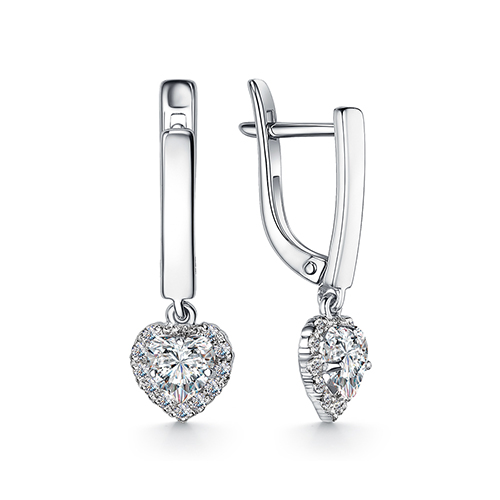 Романтичные удлинённые серьги с подвесной частью в виде сердечек, украшенных сверкающими фианитами, выполнены из белого золота 585 пробы