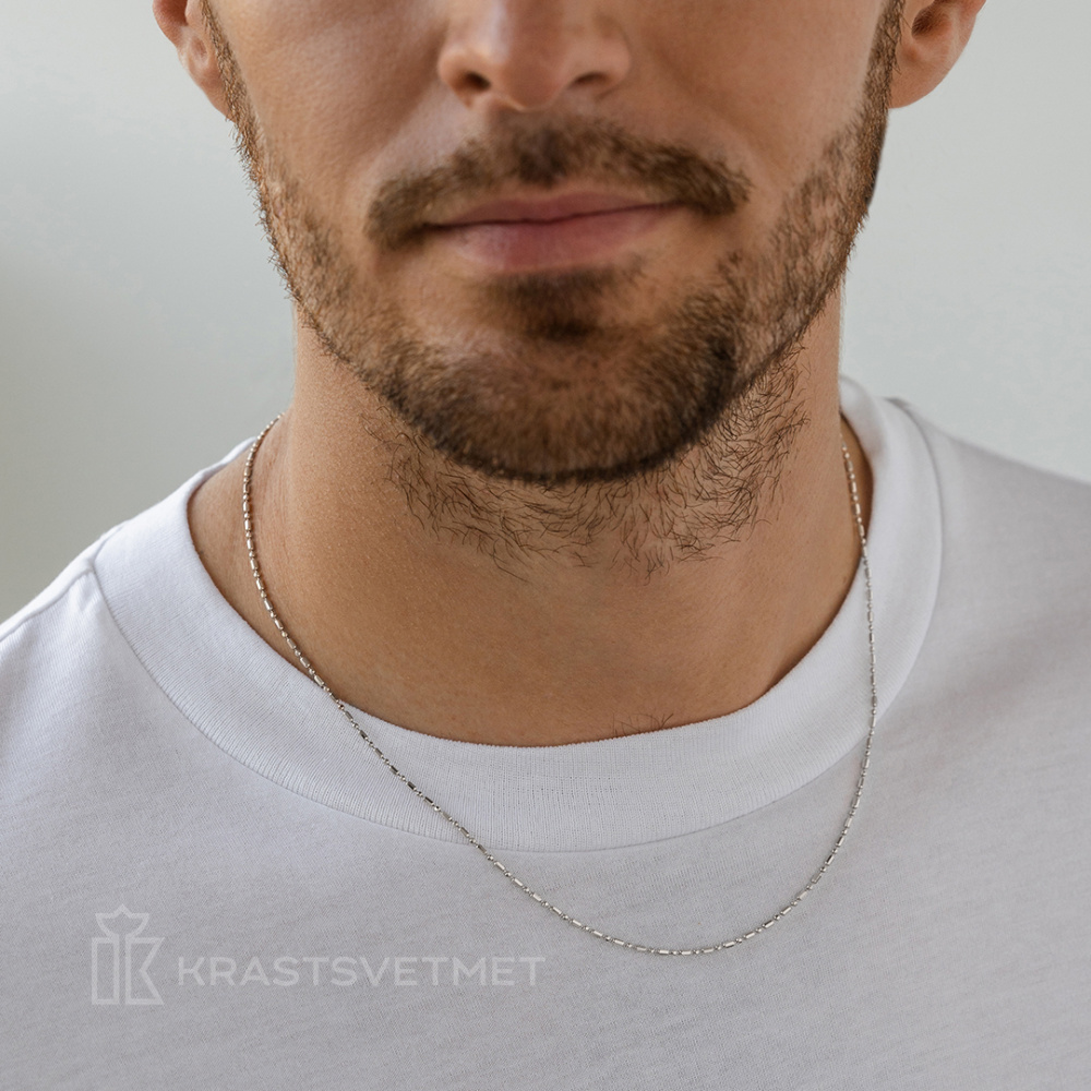 Цепь из белого золота 585 пробы с фантазийным плетением «шарик + бочка» и роскошной отделкой алмазной гранью. Диаметр проволки составляет 1,50 мм, что придает изделию объем и выразительность. Своеобразная структура плетения, состоящего из чередования шаровидных и цилиндрических элементов, создает необычную текстуру и визуально приближает цепь к драгоценным минералам. Благодаря особой обработке алмазной гранью, каждый элемент переливается и сверкает, создавая иллюзию присутствия множества мелких драгоценных камней. Такое украшение идеально подойдет как самостоятельное украшение, так и в сочетании с подвеской, привнесет в образ нотку роскоши и элегантности. Такая модель идеально подходит как мужчинам, так и женщинам, стремящимся добавить в свой образ нотку изысканности и благородства. Представлено брендом КРАСЦВЕТМЕТ. В комплект поставки входит: