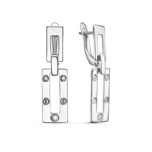 Удлинённые стильные серьги с геометричной подвесной частью, выполнены из белого золота 585 пробы, украшены искрящимися фианитами