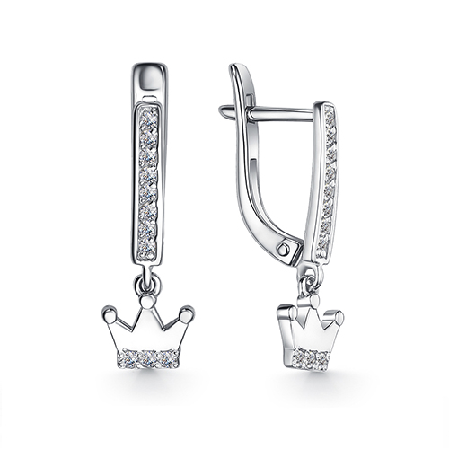 Удлинённые серьги с подвеской в виде короны, выполнены из белого золота 585 пробы, украшены сверкающими фианитами