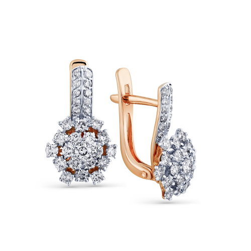 Роскошные серьги с бриллиантами в фантазийном касте круглой формы, красоту которого подчёркивает двойная дорожка меньших по размеру бриллиантов, выполнены из красного и белого золота 585 пробы