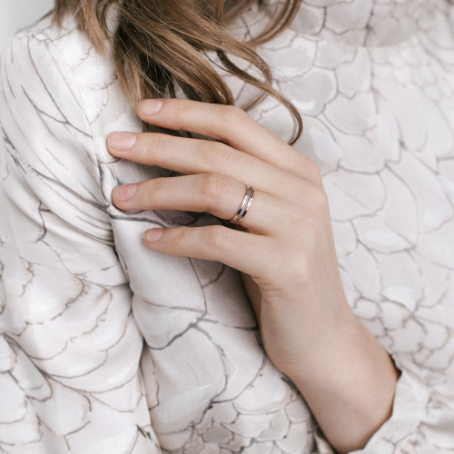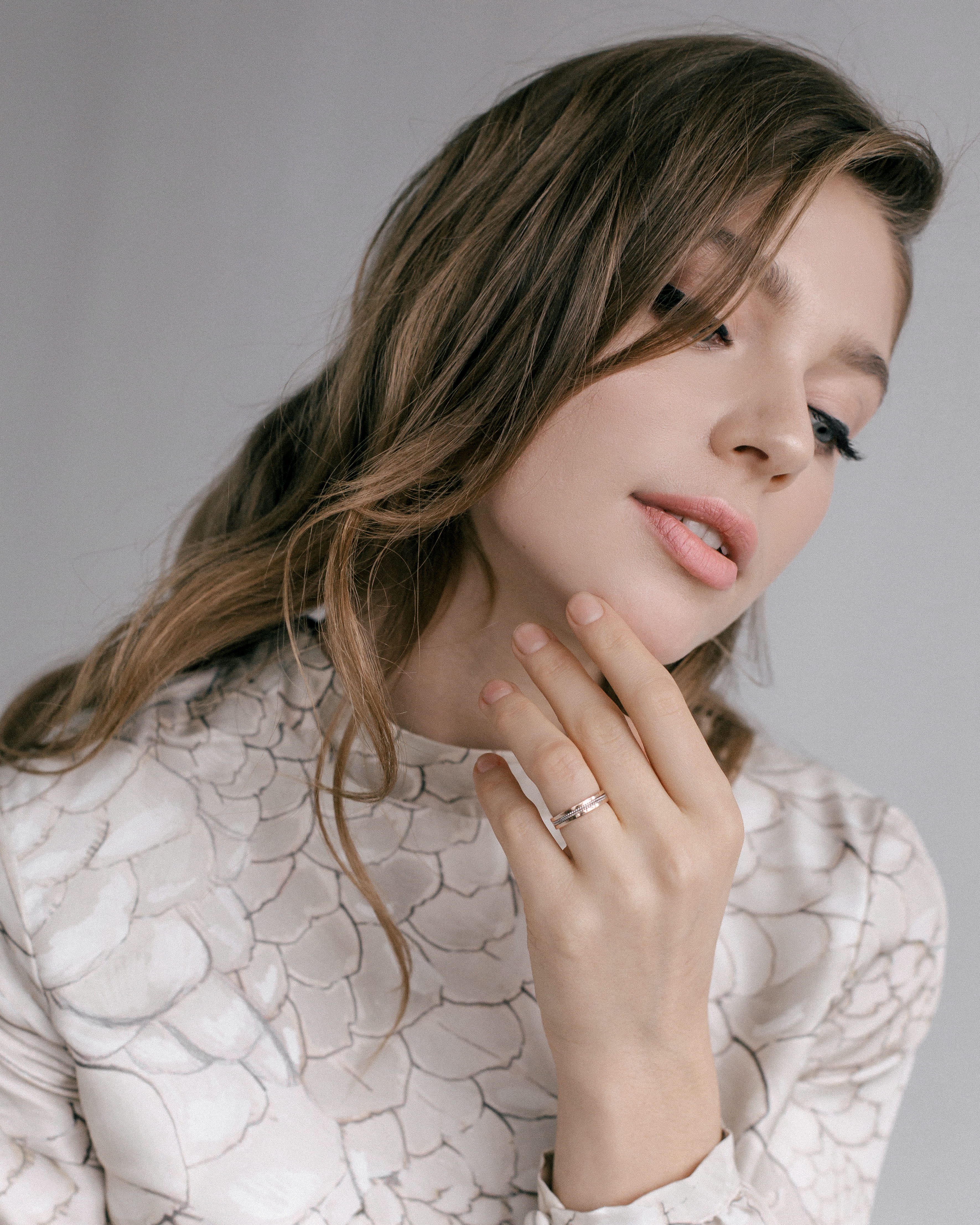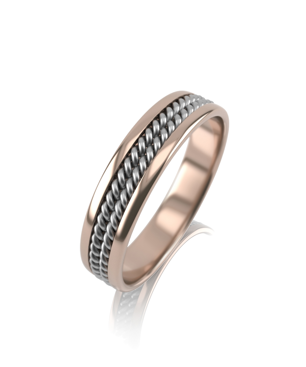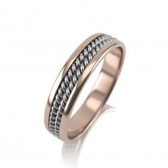 Обручальное кольцо выполнено из комбинированного золота, в сочетании красного и белого, с применением техники нео-филигрань, являясь данью вековым традициям в поисках новых решений