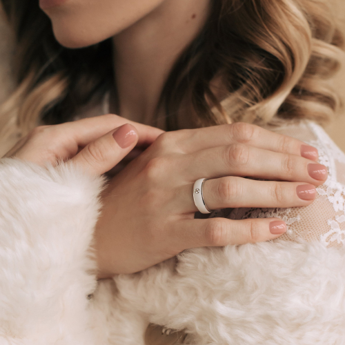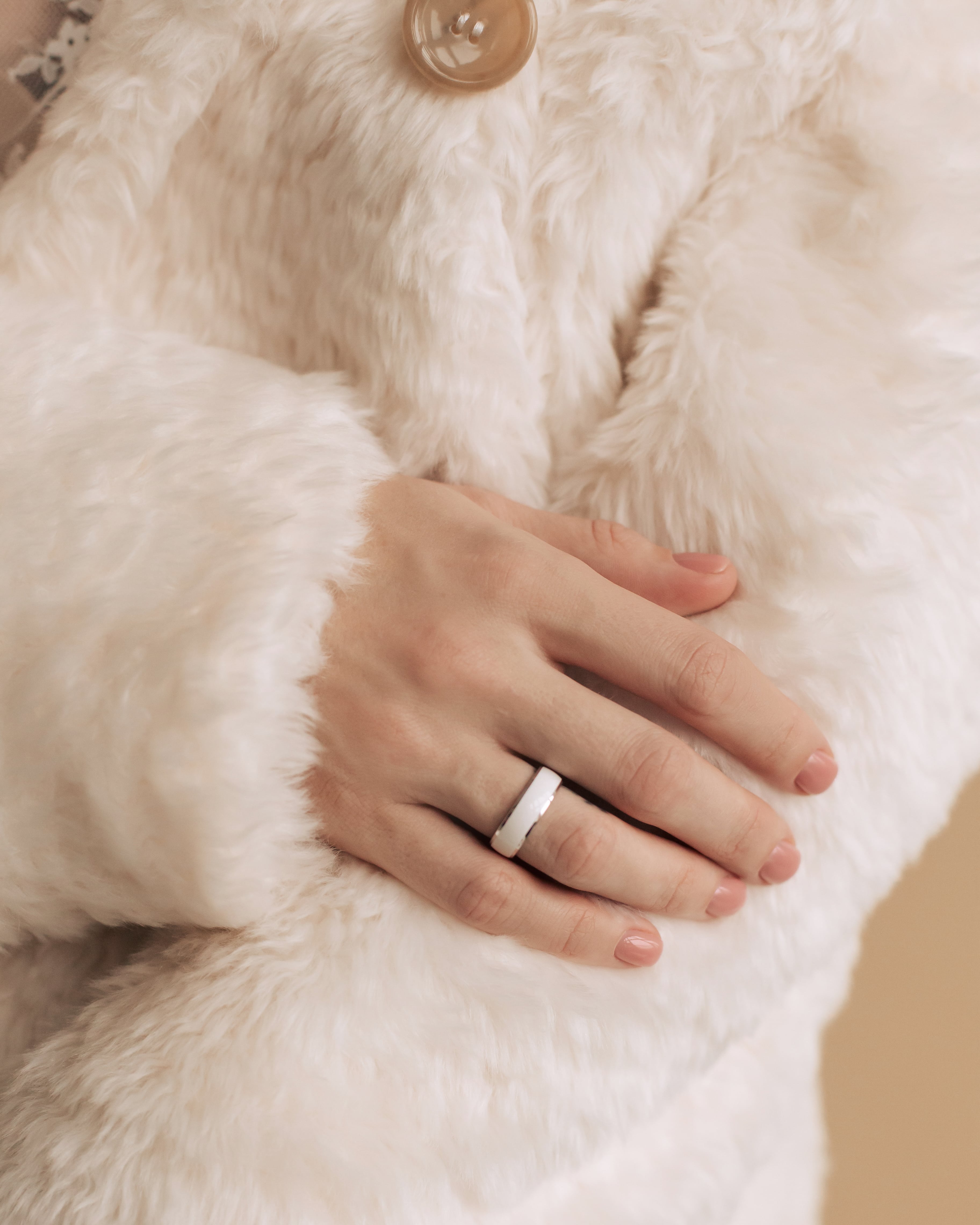Особую оригинальность кольцу придают края из белого золота в сочетании с идеально гладкой поверхностью белой керамики.