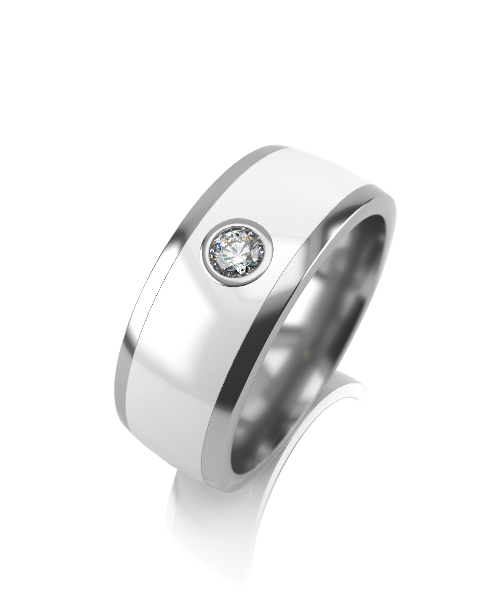 Стильное широкое обручальное кольцо из белого золота 585 пробы, с керамикой белого цвета и бриллиантом.
