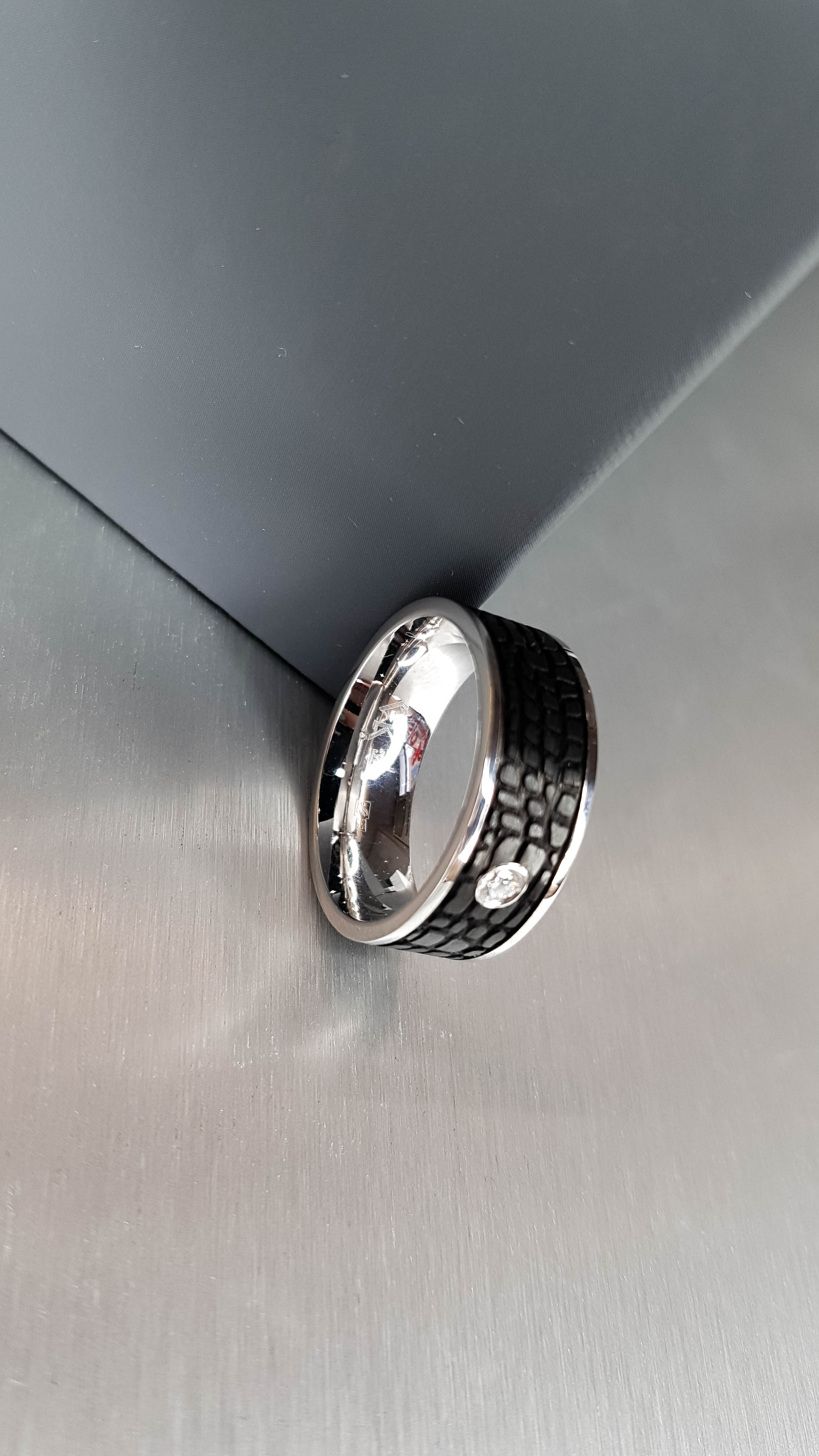 Широкое эксклюзивное кольцо из белого золота 585 пробы с карбоном, со вставкой из бриллианта.