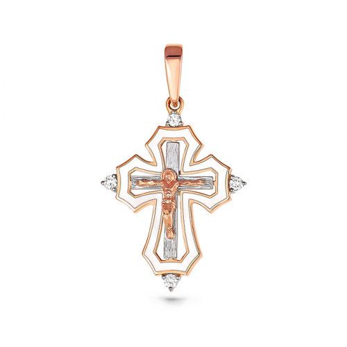 Эксклюзивный православный крест выполнен в сочетании красного и белого золота 585 пробы, от ювелирного Дома «Kabarovsky», с бриллиантами и горячей эмалью белого цвета