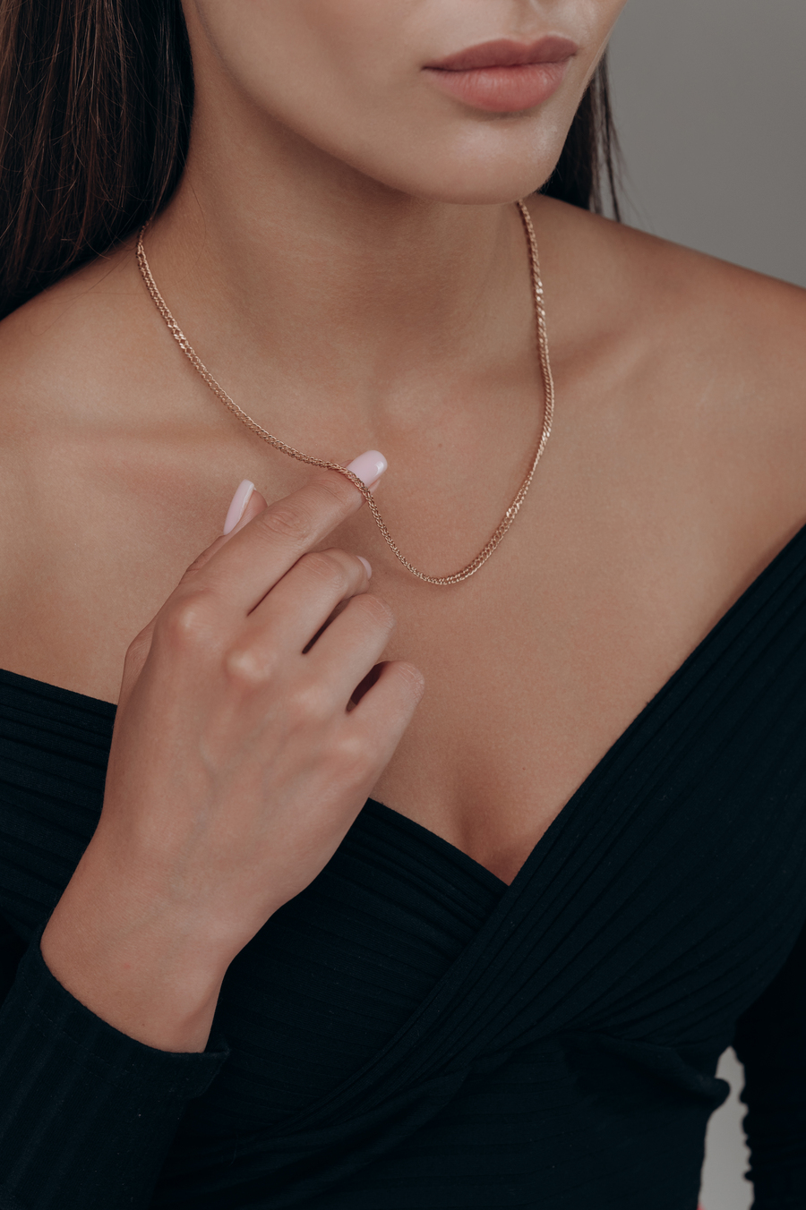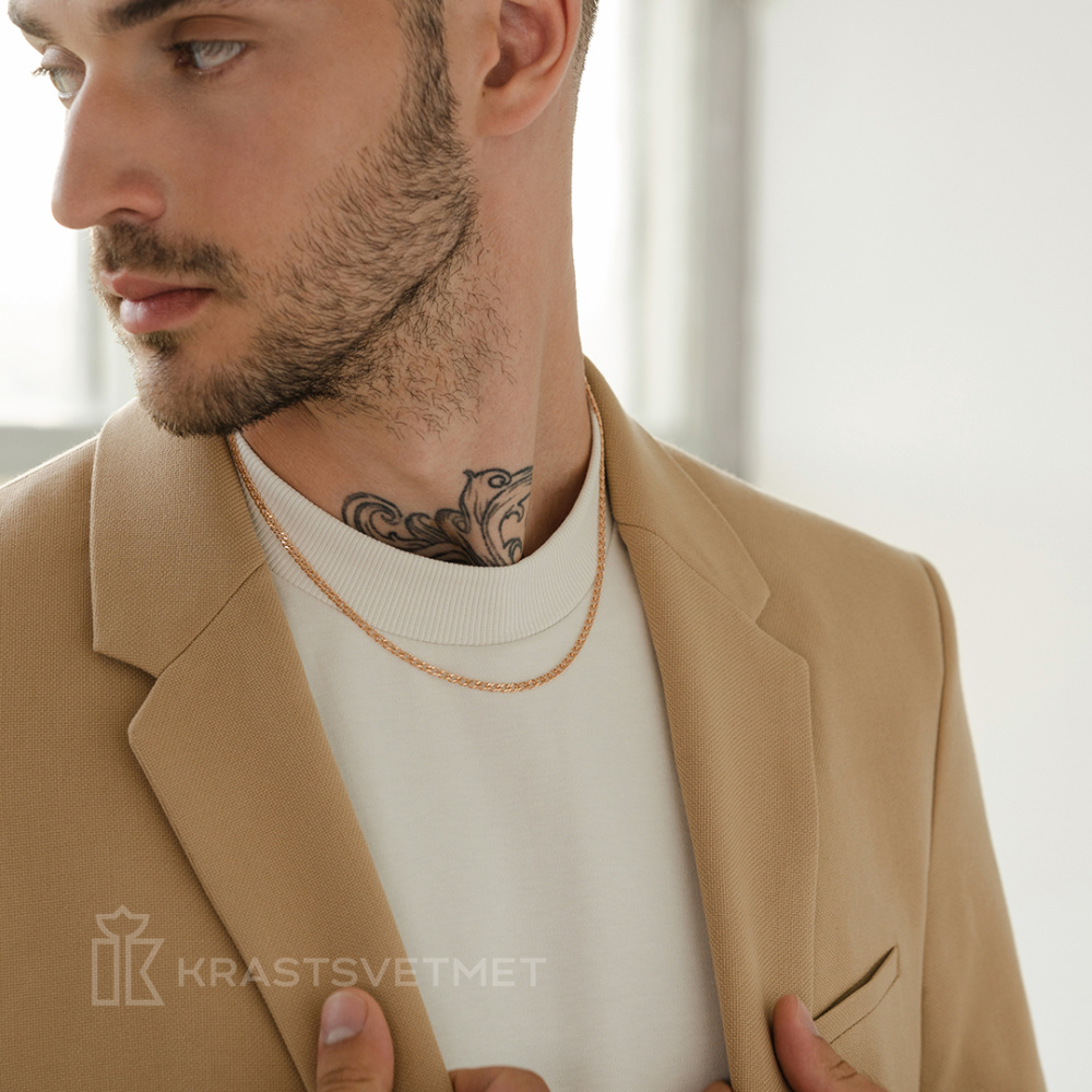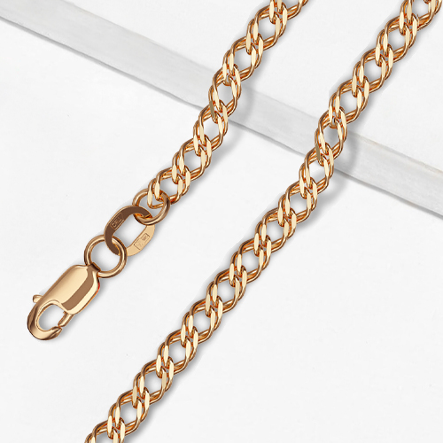 Полновесная цепь из красного золота 585 пробы выполнена традиционным плетением «двойной ромб», покрытая фирменной обработкой алмазной гранью