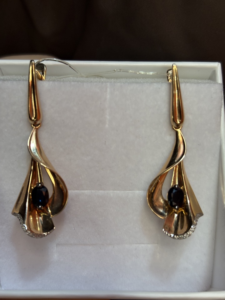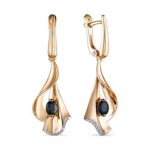 Роскошные серьги, выполнены в сочетании красного и белого золота 585 пробы, украшены великолепными сапфирами и сияющими бриллиантами
