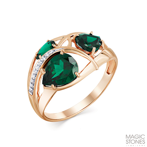 Роскошное кольцо из красного золота 585 пробы с гидротермальными изумрудами, красоту и блеск которых подчёркивает дорожка сверкающих фианитов