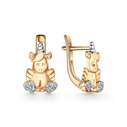 Милые детские серьги с единорожками выполнены с сочетанием красного и белого золота 585 пробы, украшены фианитами