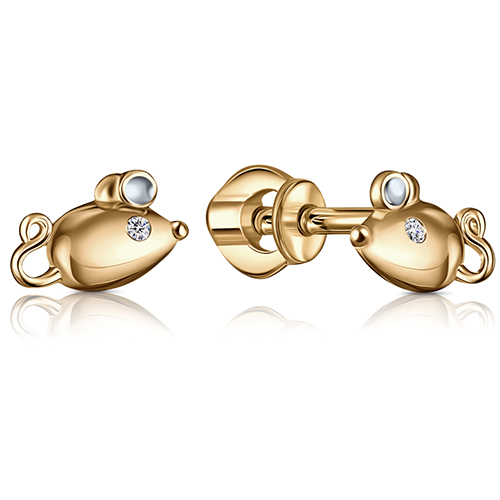 Нежные детские серьги, в виде мышей, выполнены из красного золота 585 пробы и украшены сияющими фианитами