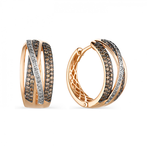 Истинных ценителей красивых и оригинальных ювелирных изделий непременно заинтересуют такие серьги из красного и белого золота 585 пробы с великолепными сияющими бриллиантами коньячного цвета