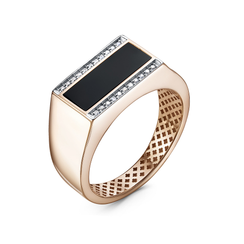Стильная мужская печатка выполнена в комбинированном золоте 585 пробы, украшена черным ониксом и фианитами