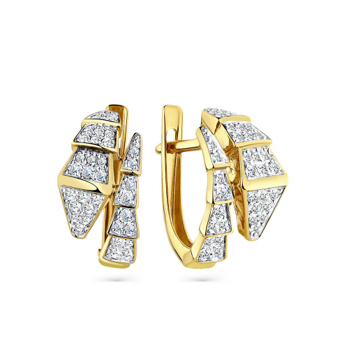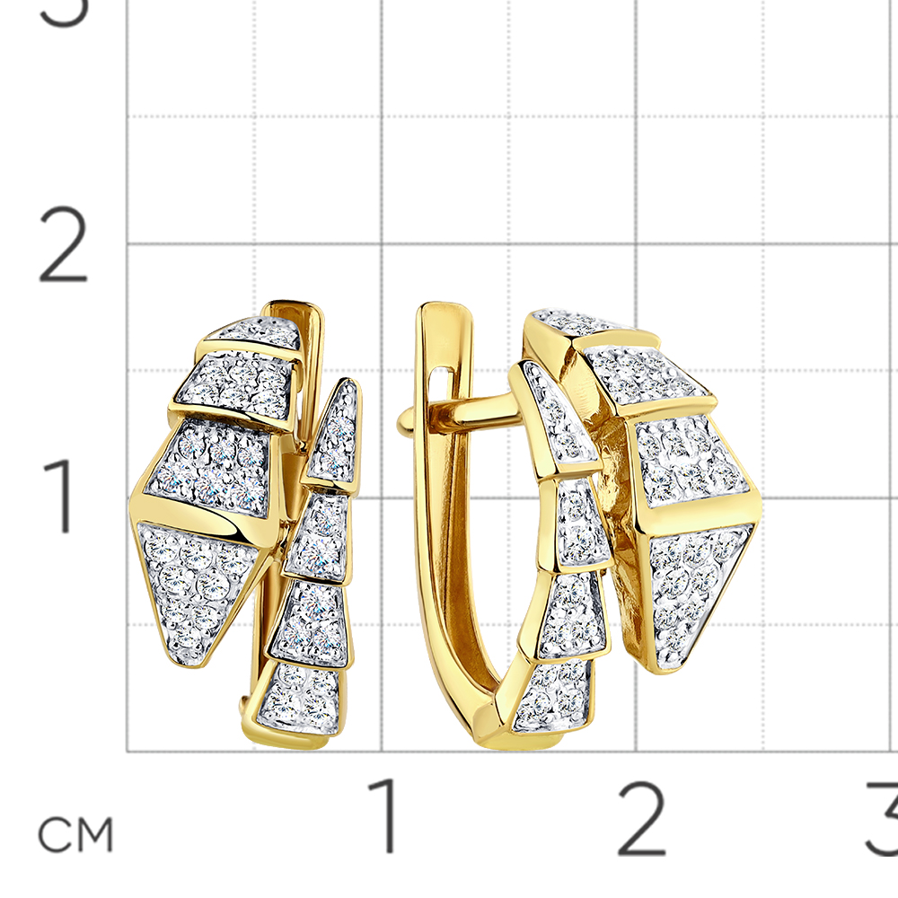 Объемные серьги с фианитами выполнены из комбинированного белого и желтого золота 585 пробы