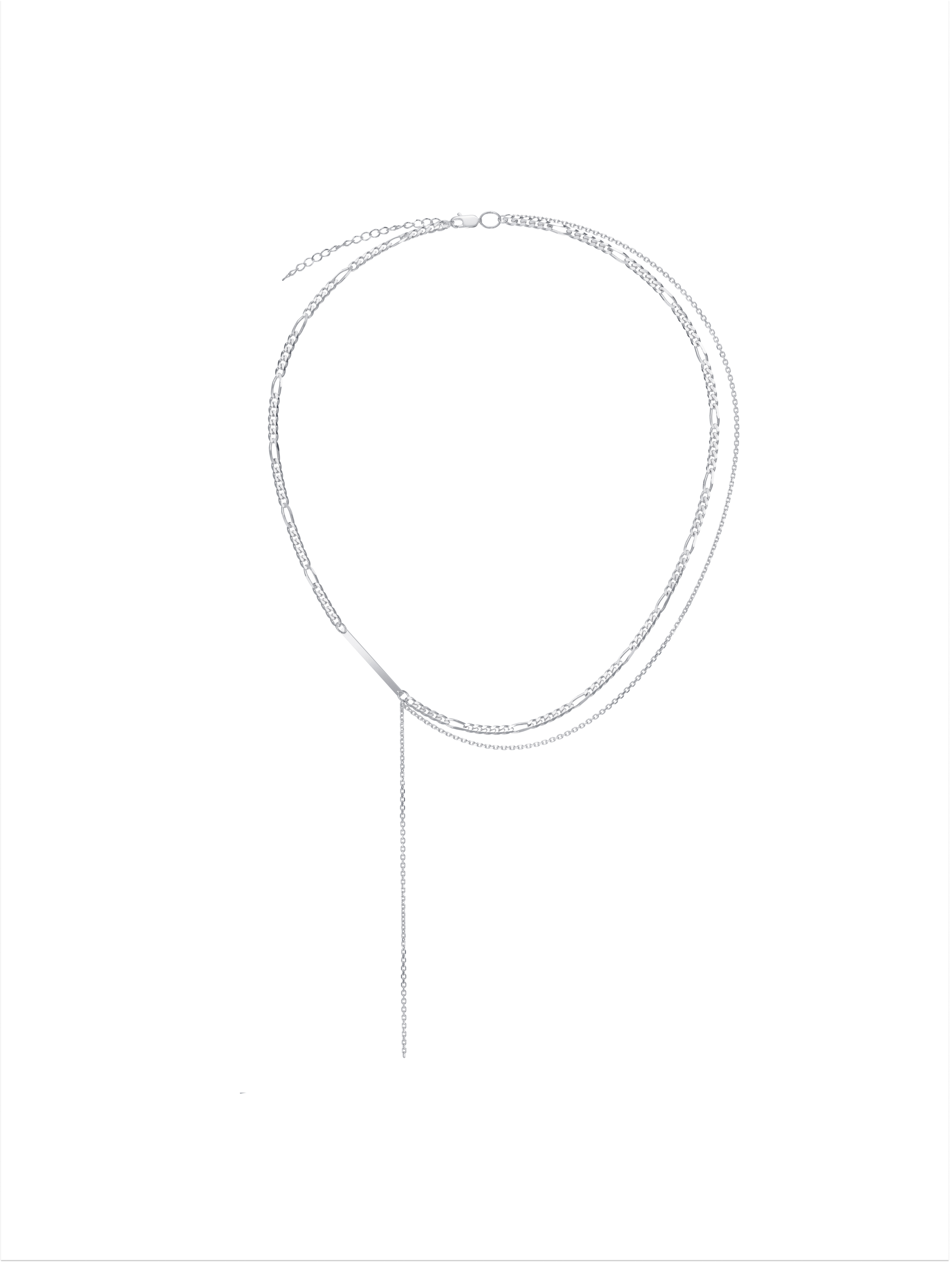 Стильное ассиметричное колье с основой из фигаро 5+1 (d 0,8 мм) и кобры (d 0,45) cо спадающим полотном из кобры (d 0,45мм) выполнено из серебра 925 пробы