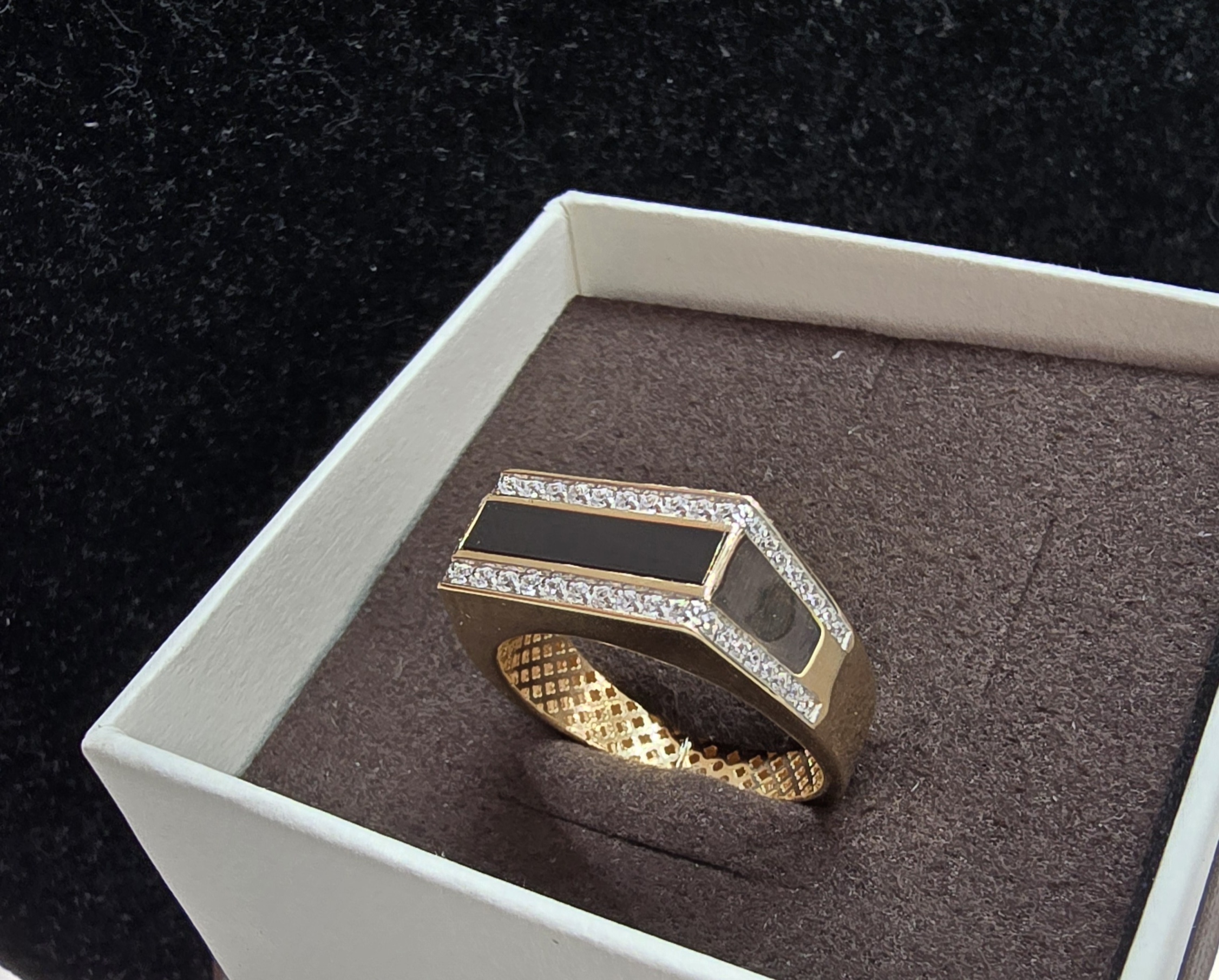 Стильная мужская печатка выполнена в комбинированном золоте 585 пробы, украшена черным ониксом и фианитами