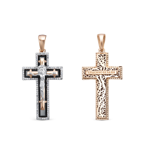 Нательный крест прямой формы, украшенный черным ониксом и фианитами, выполнен из комбинированного золота 585 пробы, в ней исполнены все каноны Православной Церкви, на внешней стороне креста распятие, на обороте надпись "Спаси и Сохрани"